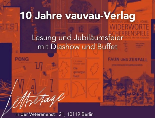 Am zurückliegenden Samstag feierte der vauvau-Verlag für interaktive Lyrik sein 10-jähriges Jubiläum in der Lettretage Berlin. Die Verleger Christian Vater und Thomas G. Voemel leiteten den sehr schönen Abend, bei dem viele Verlagsautor:innen da waren, so neben Ursula Seeger und mir etwa Julia Dorsch, Patricia Falkenburg, Lars-Arvid Brischke, Sina Nowikow und Holger Brülls.