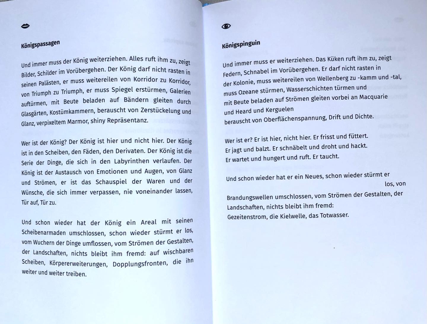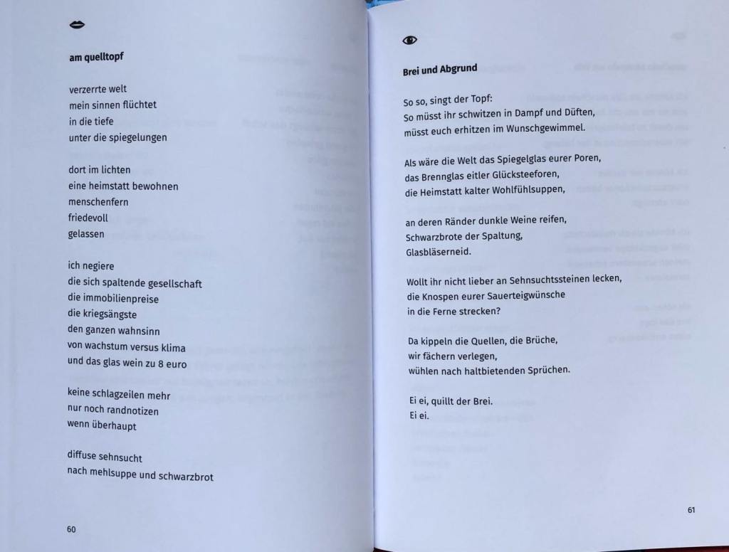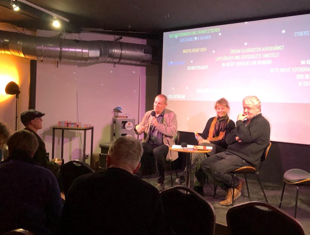 Dabei wurde die zum Jubiläum erschienene Anthologie vorgestellt, in jede:r Autor:in ein eigenes Gedicht beisteuerte und auf ein Gedicht einer andere:n Autor:in reagierte. Bei mir war das „Königspassagen“, worauf Sina Nowikow mit „Königspinguin“ reagierte. Auf Ottmar Kienles „am quelltopf” antwortete ich mit“Brei und Abgrund“