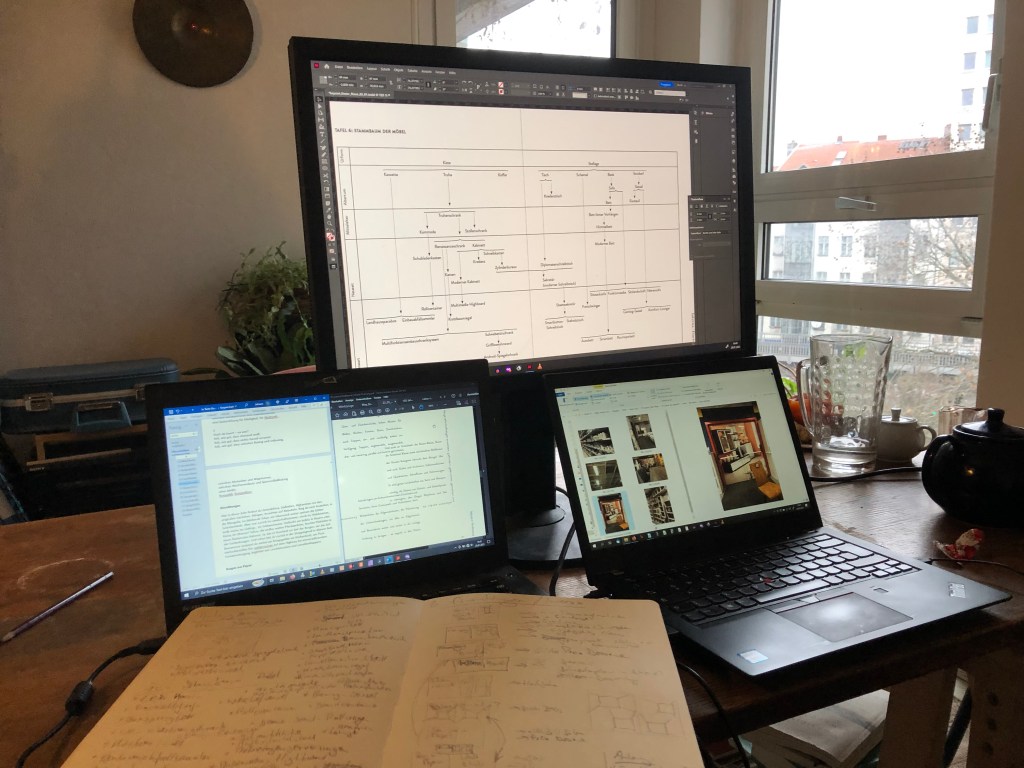 Ursula Seeger und ich arbeiten aktuell am Kapitel „Einrichtungen/Interna“ unseres lyrisch-grafischen Projekts über menschliche und nichtmenschliche Gehäuse. Darin geht es u. a. um das Gewusel von Bücherläusen und Bücherskorpionen zwischen Küchenkrummen und Bücherwäldern, um Familienaufstellungen mit Knarzstufen und Hängeböden und um das Weiterwuchern eines quasi-phylogenetischen Stammbaums der Möbel aus dem 19. Jahrhundert in Richtung Gegenwart.