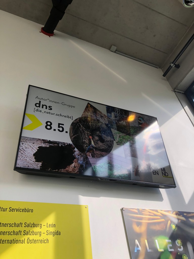 Vom 5. bis 8. Mai traf sich die Literaturgruppe dns [die_natur.schreibt], bei der ich nun seit einigen Monate nauch dabei bin, in der ARGEkultur in Salzburg, um Möglichkeiten poetischer Verflechtungen zwischen menschlicher und nichtmenschlicher Natur zu diskutieren. Am letzten Tag gab‘s zum Abschluss des Treffens eine schöne Lesung im Veranstaltungssalon der ARGE.