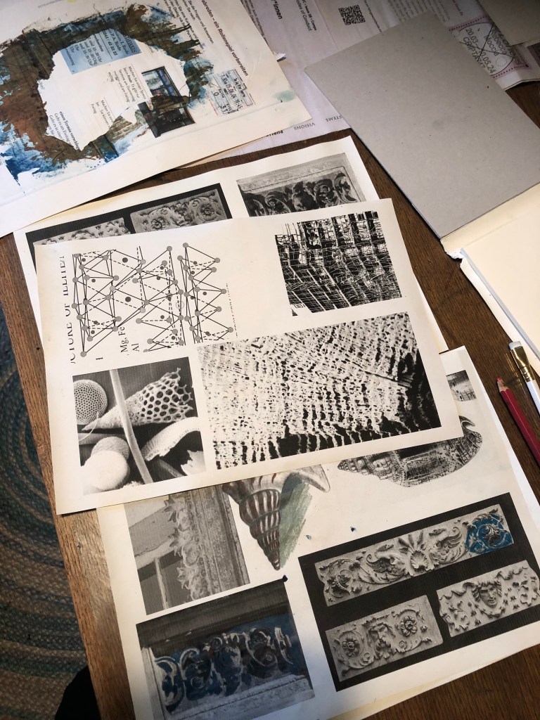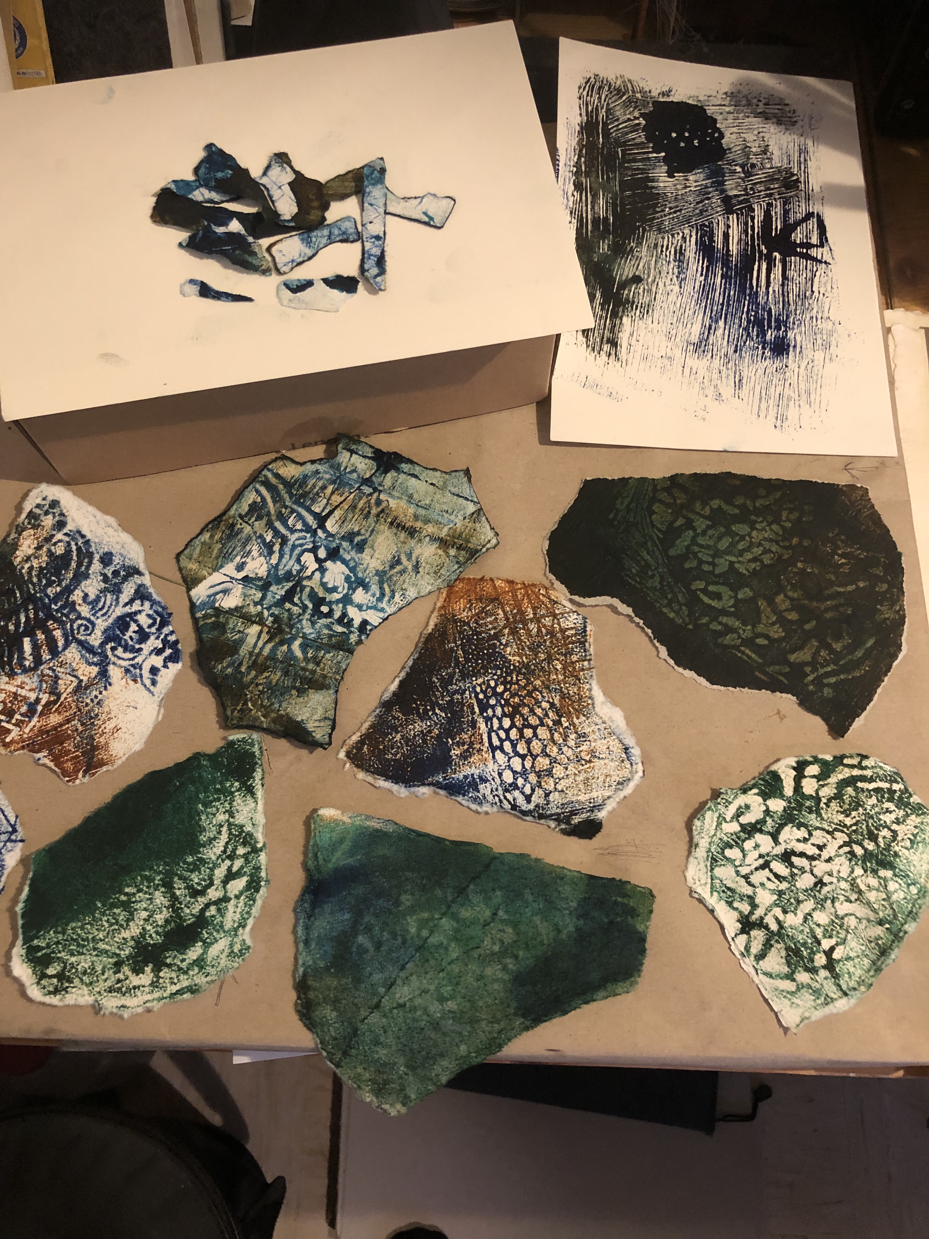 Ursula hat neue Papierobjekte für die Kapitelanfangsseiten unseres lyrisch-grafischen Buches „GEHÄUSE – Zwölf Schleifen zwischen Zellen und Clouds“ im experimentellen Monoprintverfahren angefertigt.