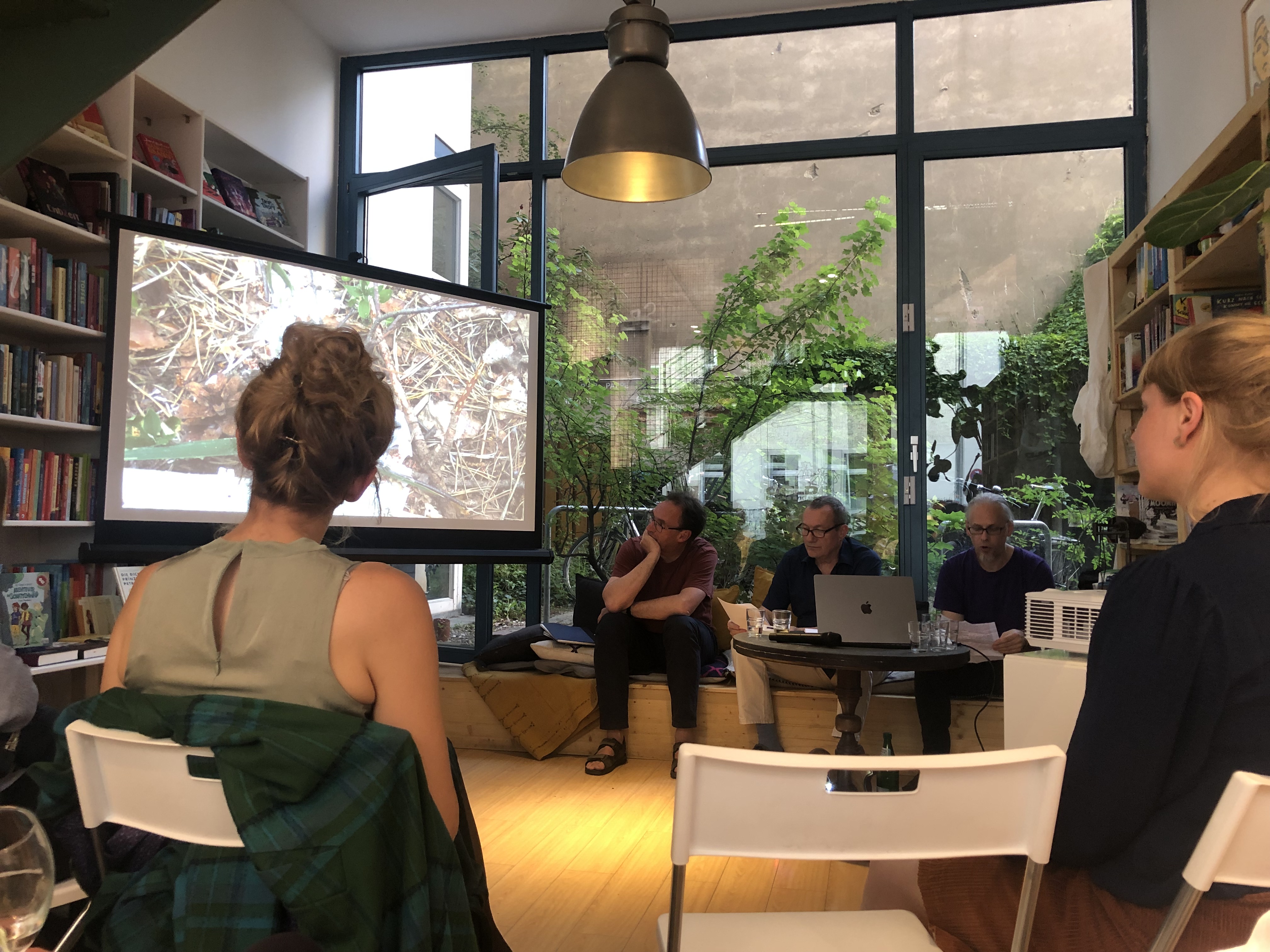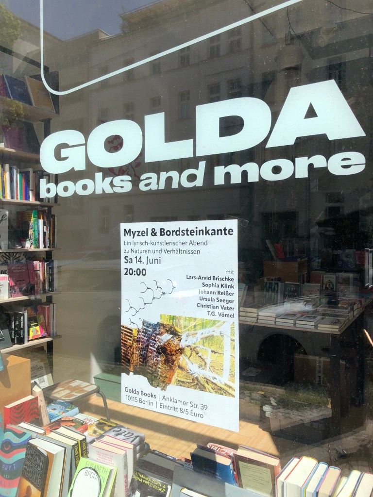 Am 14.6. fand die Lesung „Myzel und Bordsteinkante“ in der tollen Buchhandlung GOLDA books in der Anklamer Straße in Mitte statt. Bei dem lyrisch-künstlerischen Abend zu Naturen & Verhältnissen lasen Lars-Arvid Brischke, Sophia Klink, Christian Vater, T. G. Vömel, Ursula und ich. Es war eine schöne, abwechslungsreiche Veranstaltung mit Gedichten nicht nur über Gehäuse, sondern u. a. auch über Fischzuchtkreisläufe, Beforstungsmuster und Mauerseglernichtbeerdigungen sowie mit Videos von lyrikumwickelten Bäumen.