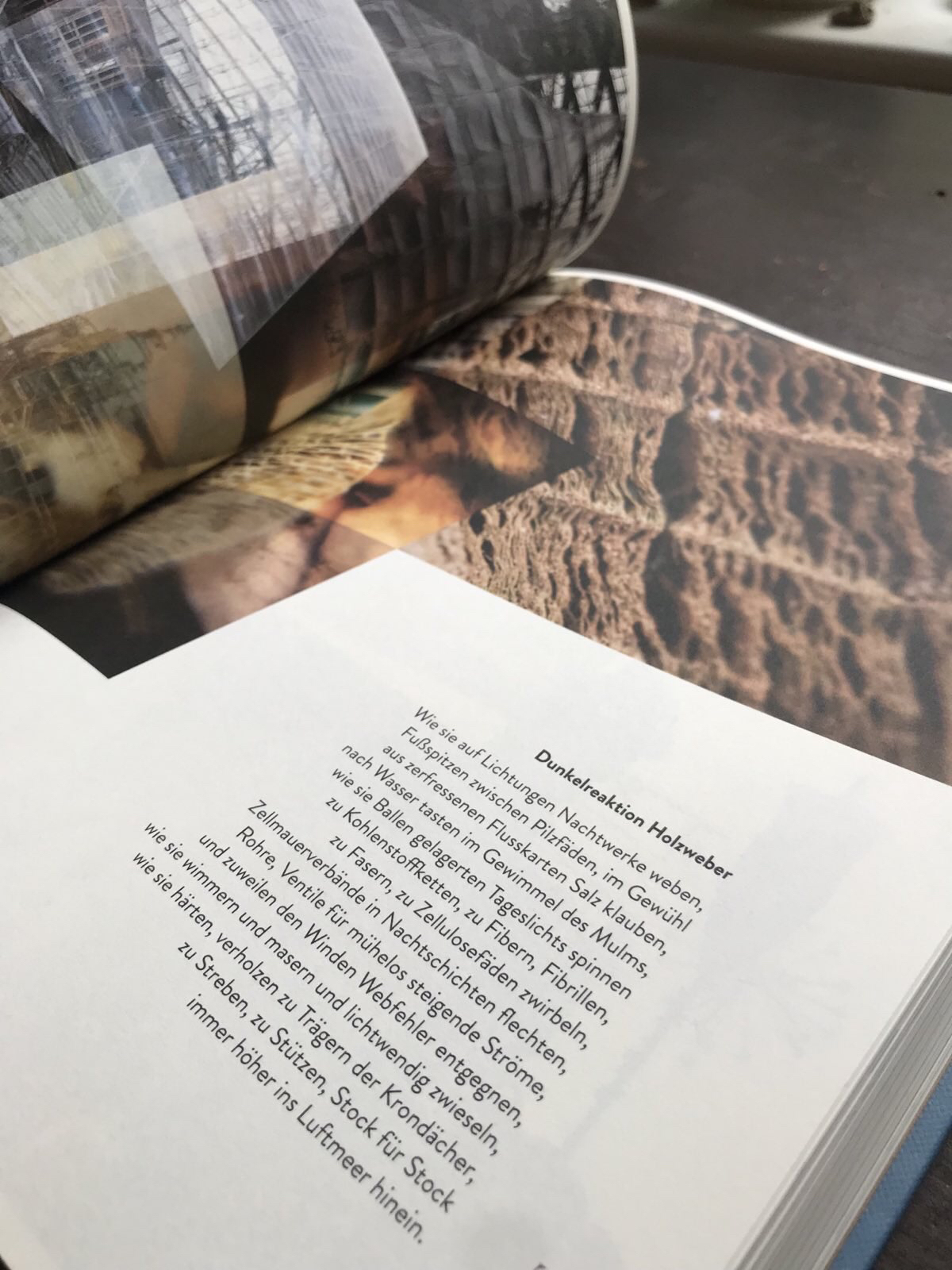 Der Schreibprozess verlief in stetigem Austausch. So entstanden zwei Text- und Bildstränge, die sich in ihrer Anordnung abwechseln, aufeinander reagieren und vielfache Bezüge zueinander aufbauen. Die Bewegung dieses verflochtenen Text- und Bildbandes verläuft flussabwärts.“