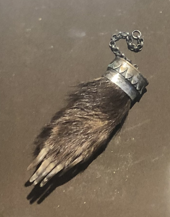 Dachspfoten galten hier einst als unheilabwehrend. Man trug sie an Charivaris – Schmuckketten, an die man Zähne, Haare, Gebisse, Knochen oder eben auch Pfoten von Tieren hing, im Glauben, die Kräfte dieser Tiere gingen auf den Träger oder die Trägerin über.